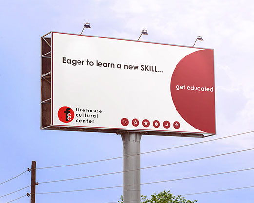 I dabbled with other collateral pieces such as billboard advertising (below photos), I made a couple different versions of the billboard/web ads that could be posted in town or simultaneously on their website. I didn’t want to go with too much imagery and stayed with similar shapes and color from the logo itself and the copy on the ad was simplistic, I also used some of the symbols they use for their educational programs in house so it’s recognizable by those who frequent this organization.