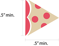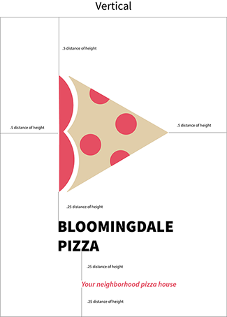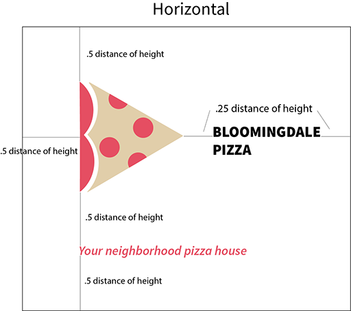 Below, are some of the white space parameters shown and the minimum and maximum application sizes for the Bloomingdale logo, it's from .5 inch to accommodate such items as a name tag, to as large as an exterior building signage. The length is measured from the left side of the Pizza crust shaped letter “B” to the right side of the pointed edge of the pizza slice.
