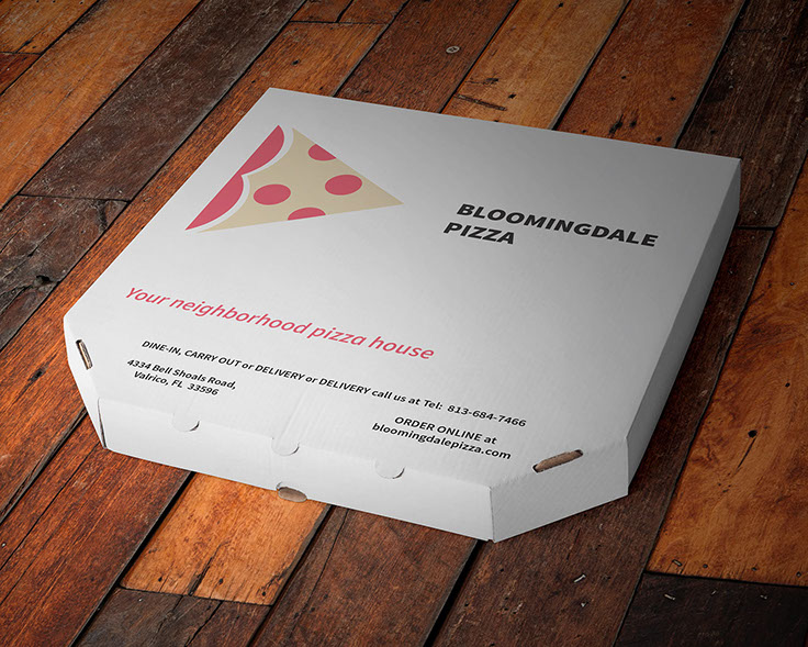 This is an example of how the pizza boxes would look like when using the new brandmark to identify Bloomingdale Pizza, instead of having a generic box with no identity of the restaurant as most mom and pop restaurants tend to use because they are cheaper to purchase in bulk.