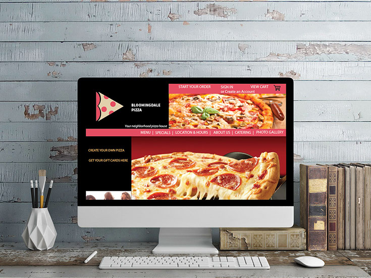 To the right, is an example of how the redesigned website could be like with the new brandmark in place. It’s a bit more inviting with vivid looking pizza images to entice webpage visitors and in the navigation bar it includes links to find menus, specials, location and hours, catering options and a photo gallery link.