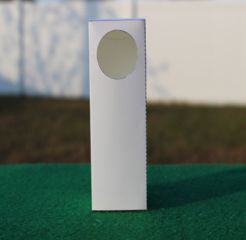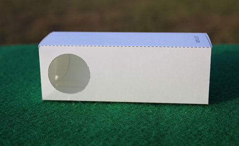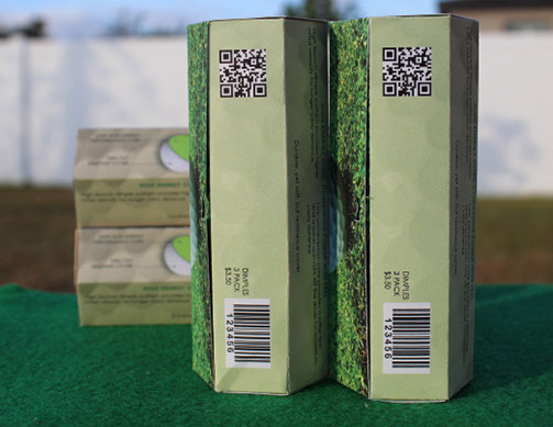 On the back side panels of the package, you will see a dimpled textured background for a sense of depth along with a simulated cut-out of a golf ball graphic and descriptions.