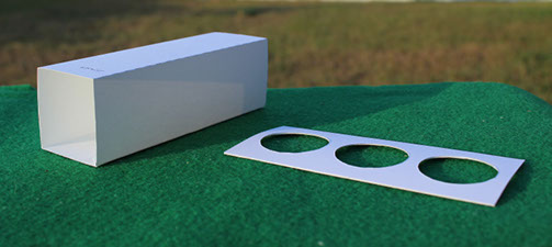 Initially, I tried two different types of golf ball packaging templates, the traditional oblong square shaped box with a window cut-out for the ball to be seen (in the two photos to the right) and in the second version (the above set of photos) was to be a translucent outer box and a cardboard insert that held the 3 balls in place.