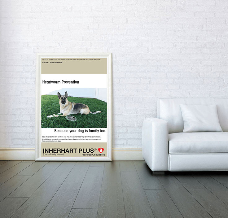 This project was my first introduction to learning how to create templates for packaging and also to apply minimal graphics and proper hierarchy placement. We were to design a package, instructional insert, monthly reminder stickers and a promotional poster for a heartworm medication for dogs.
