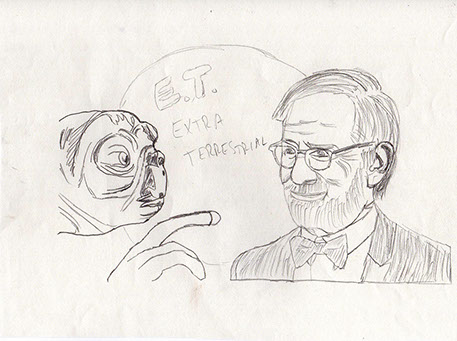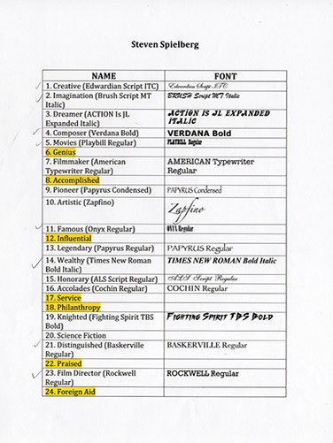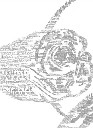 The purpose of this project was to pick a famous person and create a portrait of them in an iconic way. Steven Spielberg was my choice and after conducting more research on his background, I used some of his famous and notable attributes he is known for and incorporated that into his portrait (seen here in this photo). I used about 20 different typefaces (fonts) to help shape him and his most famous movie character, E. T.