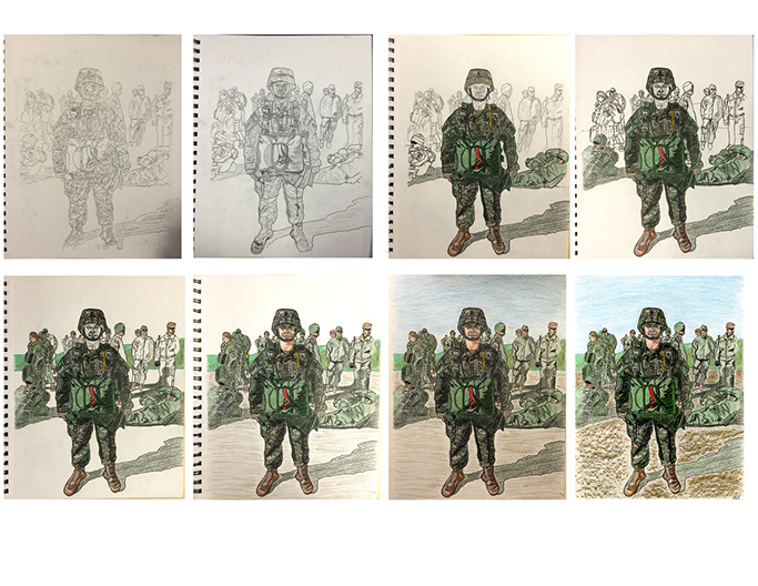 To the right, you will see my reference photo and above is my drawing process from a sketch outline, to the integration of color and texture as you see it from the top left to right and onto the second row.