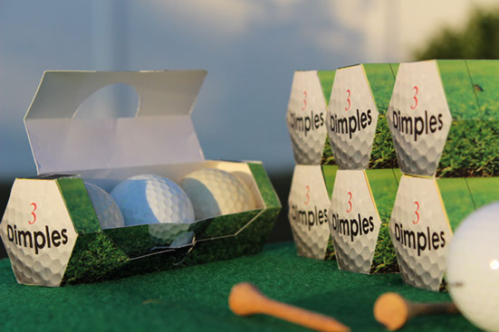 On the right and left end of the box, I placed a photo of a real ball on each side and my product name “Dimples” wrapping around the ball with the number on top showing the number of balls in the package and similar to how the ball is stamped with the brand name and number.