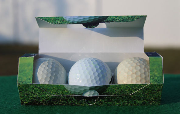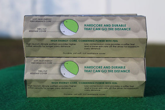 On the back side panels of the package, you will see a dimpled textured background for a sense of depth along with a simulated cut-out of a golf ball graphic and descriptions.