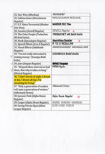 The most difficult task for me was coming up with the best fonts to use (photos to the right) and how to get started, it wasn't an easy feat initially.